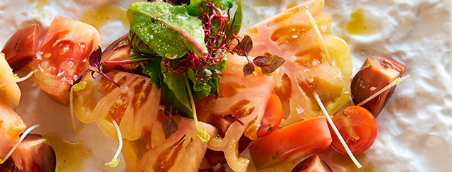 Amanida de tomàquets confitats, tonyina fresca i oli de vainilla